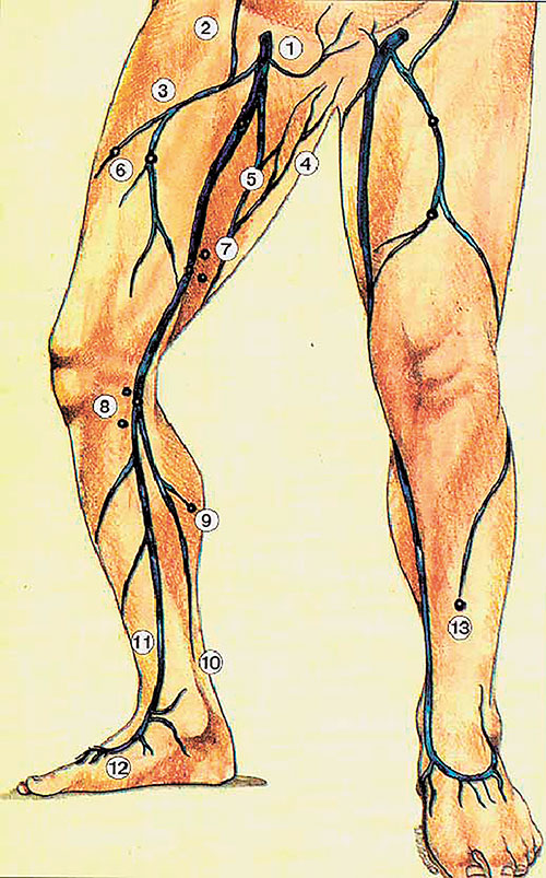 Рис. 2.1. Анатомия большой подкожной вены (из [1]): 1. Наружная срамная вена. 2. Поверхностная надчревная вена. 3. Латеральная добавочная подкожная вена. 4. Перинеальные вены. 5. Медиальная добавочная подкожная вена. 6. Перфоранты к латеральной добавочной вене. 7. Перфорантные вены Додда. 8. Перфорантные вены Бойда. 9. Медиальные икроножные перфорантные вены. 10. Задняя арочная вена. 11. Большая подкожная вена. 12. Медиальная краевая вена. 13. Малоберцовая перфорантная вена