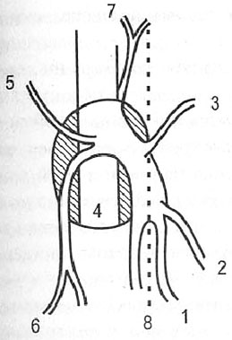 Рис. 2.2. Схема сафенофеморального соустья: 1. V. saphena magna. 2. V.saphena accessoria medialis. 3. V.pudenda externa. 4. V.femoralis communis. 5. V. circumflexa ilii superficialis. 6. V. saphena accessoria lateralis. 7. V. epigastrica superficialis