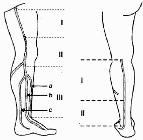 На голени ствол БПВ располагается по передневнутренней поверхности, вдоль медиального края большеберцовой кости. В нижних 2/3 голени вена лежит во втором листке поверхностной фасции голени и прочно связана соединительнотканными перемычками с глубокой фасцией, в связи с чем она реже расширяется, а само расширение прямолинейное, тубулярное, без вариксов. У худощавых субъектов ствол вены на голени может пальпироваться. Необходимо помнить, что в этой зоне к вене интимно прилегает подкожный нерв, который может быть поврежден при оперативном вмешательстве и паравазальных инъекциях и стать причиной постлечебных парестезий и каузалгий.