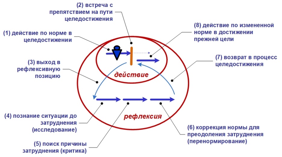 1. Рефлексия и три ее стадии"Рефлексивная функция возникает и реализуется в любой практике деятельности, в которой возникло затруднение" (1, с.23). А поскольку реальная деятельность не может протекать без затруднений достаточно продолжительное время, то можно онтологически значимым образом утверждать, что рефлексивное сопровождение затруднений действий является неизменным атрибутом любой практики. При этом сама рефлексия, как аналитический путь преодоления затруднения (в противовес силовому "слому" препятствия), вначале может быть неосознаваема и иметь предельно свернутый во времени характер. Большую развернутость анализ затруднения приобретает при росте "мощности" и труднопреодолимости препятствия, т.е. при возникновении проблемной ситуации. Последнее, наряду с ростом ответственности за принимаемое решение по "снятию" затруднения, способствует со временем расщеплению единого процесса рефлексии с акцентом на перестройку способа действий, сначала на два шага – познание и перенормирование, а затем и на три, когда в качестве третьего звена появляется шаг, предшествующий перенормированию: критический поиск причины затруднения. Данное критическое звено рефлексии становится фактором снижения уровня случайности содержания измененной нормы действия, следование которой должно гарантировать преодолимость затруднения, запустившего рефлексию".