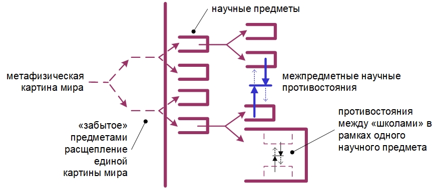 6. Предметная разобщенностьМножественность расщеплений единого взгляда "на фокусировки", потом на "фокусировки в сфокусированном ранее" и т.д. приводит со временем к потере единого источника всех знаний о мире – метафизики. Научные предметные области как бы начинают жить обособленно, порождая внутри себя следующую популяцию еще более узких знаниевых фокусировок. Эта тенденция неминуемо приводит нас к росту межпредметных "перегородок", все более отдаляющих друг от друга даже весьма родственные знания. У каждого научного направления возникает "своя научная история, свои критерии организации, осуществления исследований и оценки результатов… Отдельный ученый все меньше способен объединить все научные знания и превращается в узкого знатока своей области" 1, с.26. Между "знатоками своей области" растут "барьеры" взаимонепонимания, т.к. в каждом предмете появляется и своя терминология, свой "язык". Складываются и специфичные внутрипредметные методологии исследования, которые хотя и имеют общие черты (например, наличие эмпирических исследований, теоретического конструирования знания и т.п.), все же по существу разительно отличаются друг от друга. Растут противоречия и между различными "школами" в рамках одной предметной области. Указанные межпредметные противостояния тем сильнее, чем более забывается единый метафизический исток24 (см. сх. 2).