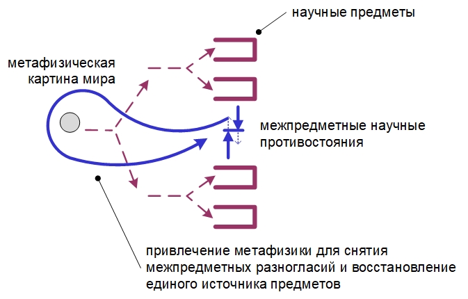 Такова, в общих чертах, тенденция расщепления единой картины мира на узкопредметные области с кооперативно-деятельностной персонификацией этих областей. В этом контексте, метафизические аспекты должны присутствовать в предметных теоретических конструкциях в качестве глубинных надпредметных оснований, а также в виде универсального надпредметного метода познания реальности. Так должно быть по функции. В реальной научной практике все, конечно, далеко не так. Но нам важно понять истинное предназначение обсуждаемых объектов, а не искать правдоподобные объяснения сложившимся искривлениям в научных исследованиях различных отраслей знаний.