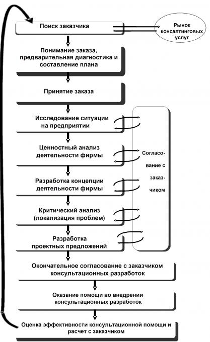 Можно заметить, что в предложенной модели консультационного процесса отсутствует крайне важная фаза деятельности любой консалтинговой фирмы – поиск и мотивация заказчика (клиента). Кроме того, в данной модели, на наш взгляд, смешаны несколько «слоев» деятельности консультанта, что явно затрудняет правильное понимание порядка шагов в консультационном процессе. Так, например, в линию аналитической работы консультанта (выявление проблем, разработка альтернатив и т. п.) вклинивается организационная составляющая (подбор членов оргструктуры и т. п.), а процесс выявления проблем дублируется на трех (!) этапах.