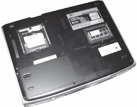 Теперь перевернем ноутбук вверх ногами и посмотрим, что у него расположено на нижней крышке. Тут, конечно, тоже ничего интересного нет. Вы увидите несколько люков, которые можно открыть, открутив специальные болты. Под одним из этих люков находится слот для установки модуля оперативной памяти. Под другим может находиться жесткий диск. В отдельных случаях еще один люк открывает доступ к плате беспроводной сети. Таким образом, вы можете заменить модуль ОЗУ или жесткий диск, не разбирая ноутбук полностью: достаточно просто снять крышку нужного люка и открутить всего один-два болта (рис. 1.3).