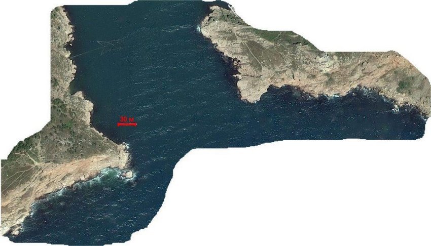 Вход (врата) в Балаклавскую бухту (спутниковый снимок. Для масштаба показан 30-метровый отрезок у северного берега)