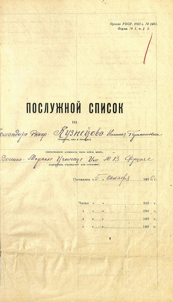 Послужной список Н.Г. Кузнецова на момент окончания Военно-морского училища в 1926 г. Из фондов ЦГА ВМФ. Публикуется впервые