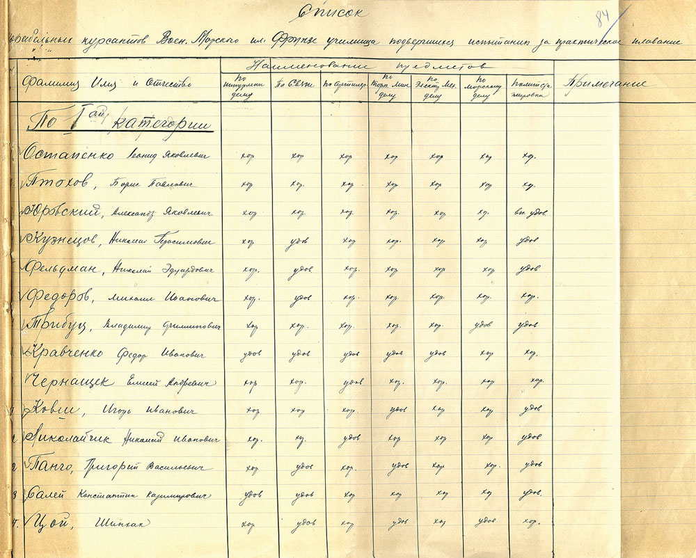 Оценочный лист за корабельную практику курсанта Н.Г. Кузнецова. Из фондов ЦГА ВМФ. Публикуется впервые