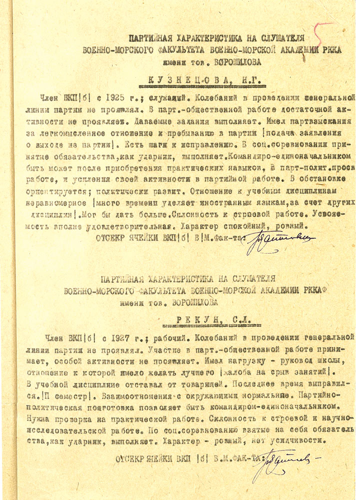 Партийная характеристика на слушателя Военно-морской академии Н.Г. Кузнецова. Из фондов ЦГА ВМФ. Публикуется впервые