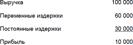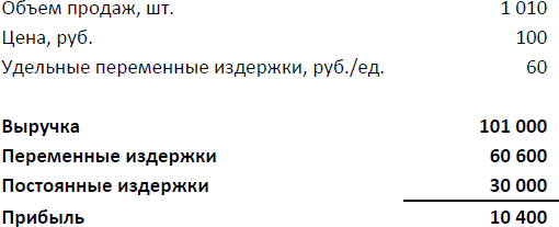 Видим, что выручка и переменные издержки выросли, постоянные издержки остались без изменения. Итак, рост объема продаж на 1% ведет к росту прибыли на 4%.