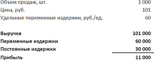 Поскольку нас интересует вопросы, связанные с ценообразованием, перепишем отчет о прибыли, добавив в него информацию о цене, объеме продаж в натуральном (то есть,в единицах измерения продукции) выражении, и удельных переменных издержках.