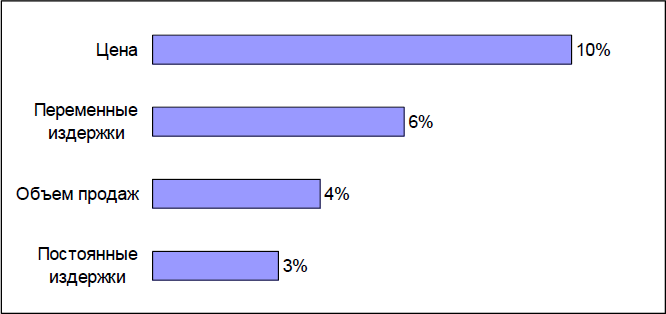 Прибыль, очевидно, зависит от следующих факторов: объема продаж, цены, удельных переменных издержек (себестоимости) продукции и постоянных издержек. А как зависит? В смысле, от чего больше? Изменим один из факторов на 1% (в сторону его улучшения в плане влияния на прибыль), а остальные оставим без изменения, и посмотрим, насколько изменится прибыль.