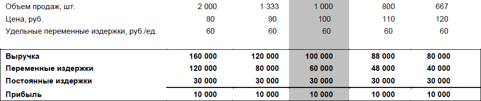 При повышении цены на 10 процентов, объем может упасть на 20 процентов, до 800 единиц, при этом прибыль останется прежней. При повышении цены на 20 процентов объем может упасть на треть, чтобы размер прибыли не изменился.