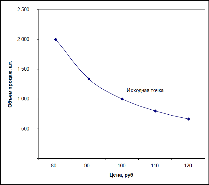 Следует заметить, что в экономической литературе принято иное расположение осей: объем продаж по горизонтали, а цена – по вертикали. Мне это представляется не совсем удобным, так как, если исходить из положения, что объем продаж зависит от цены, а не наоборот, то логично считать цену аргументом, объем продаж – функцией, зависящей от этого аргумента. И изображать, как учили в школе, аргумент по горизонтальной оси X, а функцию откладывать по вертикальной оси Y, что мы и сделали!