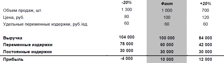 Теперь выбор варианта действий ясен: нужно повышать цены на 20%. И у нас есть шанс увеличить прибыль. А поскольку нам известна структура отчета о прибыли этой компании, то мы сможем сказать – на сколько. Для этого составим плановый вариант отчета после повышения цен – правый столбец таблицы.
