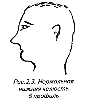 ВТЯНУТАЯ нижняя челюсть также «вылавливается» в профиль. При визуальном боковом сканировании лица создается впечатление, что верхняя губа и носовой желобок как бы нависают надо ртом (см. рис. 2.2). По-видимому, прикус зубов также изменяется, что вы можете сами у себя без труда проконтролировать.