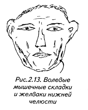 Рефлексии начинающего актераО форме подбородка мы поговорим в следующей главе, поскольку его конфигурация характеризует особенности не столько челюстные, сколько «говорильные». А вот насколько у человека развиты так называемые «желваки» – уместно и весьма принципиально для проявления бойцовских качеств характера. Подойдите к зеркалу и стиснув крепко накрепко зубы посмотрите, как изменилось ваше лицо. Расслабьтесь и проделайте это снова. Поиграйте «желваками», как говорят в народе. Так в просторечии называется место прикрепления большой жевательной мышцы к нижней челюсти. Стиснув зубы, мы ее напрягаем и визуально заметно увеличиваем в объеме. Лицо приобретает сосредоточенный и напряженно волевой вид. Антиобраз: когда глубоко утомленный или заболевший человек наконец-то засыпает, у него нижняя челюсть невольно провисает и рот приоткрывается, могут появиться даже слюни. Это и есть стадия очень глубокого физиологического и психологического расслабления. У весьма пожилых людей так происходит и во время обычного сна, вследствие снижения общего жизненного тонуса. Если человек постоянно преодолевал какие-то трудности (к примеру, спортсмен, военный, экстремал), то состояние волевой собранности и целеустремленности непрерывно держат жевательную мышцу в тонусе. Согласитесь, в жизни мы не так уж часто, кроме разжевывания твердой пищи, стискиваем зубы. Чаще всего это происходит в больнице, да и то не по нашей доброй воле. Но бывают жизненные ситуации, когда иначе, как собрав волю в кулак не достигнешь желаемого. Длительный и мощный тонус жевательной мышцы вне пищевого жевания и формирует на лице хорошо видимые мышечные складки и рельефно выступающие связки. Тонус губных и околоротовых мышц мы будем рассматривать чуть позже. Сейчас нас интересует, насколько рельефно выделяются именно «желваки» и мышечный валик жевательной мышцы по низу щеки. Схематически «волевые складки» или «волевые каналы» вместе с желваками изображены на рис 2.13.