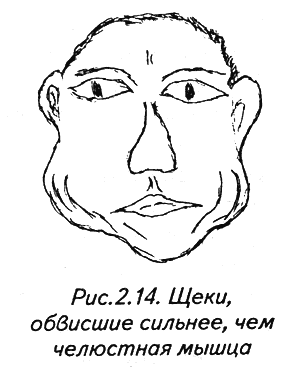 ФИЗИОГНОМИЧЕСКОЕ N. В.: постарайтесь не спутать мышечные валики челюсти с обвислыми щеками! В просторечии их еще называют «бульдожьими». Проблема в том, что сильно развитые щеки (а это совершенно другой психоанализ!) могут накрывать мощно развитые мышцы челюсти. О щеках мы обстоятельно поговорим тоже несколько позже. Сейчас нам важно воспринять то, что щеки гораздо сильнее обвисают, нежели челюстная мышца, и это поддается визуальной идентификации (см. рис 2.14.).