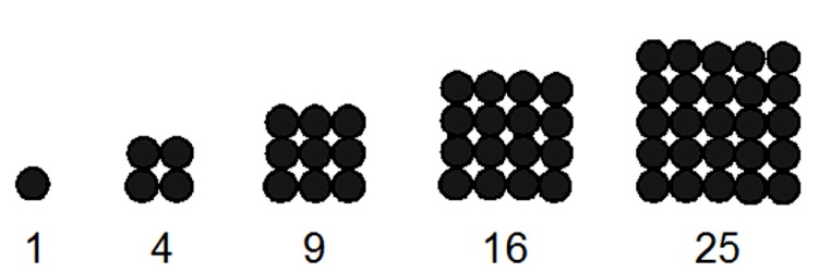 Получение квадратных чисел можно иллюстрировать построением квадратов с последовательным увеличением длины стороны квадрата: 1, 4, 9, 16, 25, 36, 49, … .