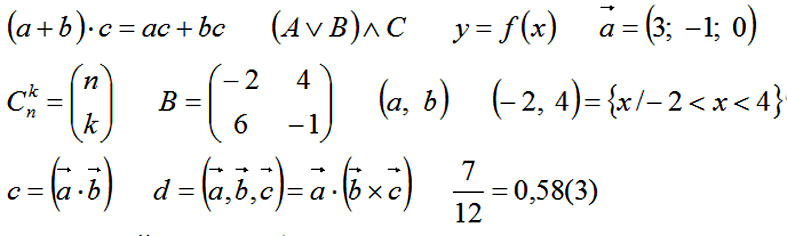 читаемые по-русски: равно, меньше, больше, не равно, корень квадратный, корень третьей степени, неопределенный интеграл, определенный интеграл, минус, плюс, умножить, разделить, объединение, пересечение, включение, пустое множество, треугольник, угол, перпендикулярно, бесконечность, модуль вектора, производная, дифференциал, сумма и многие другие.