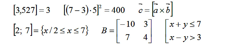 Скобки широко используются в математике, гораздо шире, нежели в русском языке. Возьмем, например, круглые скобки. В русском языке они употребляются для выделения пояснительного слова или вставного предложения. Непарная закрывающая скобка может использоваться при нумерации пунктов перечисления. Ниже, перечисляя случаи применения круглых скобок в математике, мы одновременно показываем два случая применения их в русском языке.