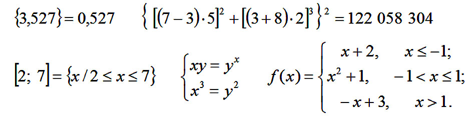 Фигурные скобки вообще вотчина математиков. Я даже не знаю, где их используют в русском языке. Фигурными скобками в одних математических текстах обозначается операция взятия дробной части числа, в других – они применяются для обозначения приоритета операций, как третий уровень вложенности (после круглых и квадратных скобок). Фигурные скобки применяют для обозначения множеств. С этим мы уже сталкивались в соответствующем разделе и в текущем изложении примеров применения скобок. Одинарная фигурная скобка объединяет системы уравнений или неравенств, служит для обозначения кусочно-заданной функции.