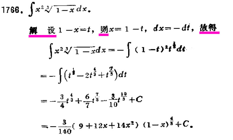 Этот решебник кустарно перепечатывался, поэтому качество печати отвратительное, но разобраться можно. В задании требуется вычислить неопределенный интеграл. Решение содержит всего пять китайских иероглифов, а всё остальное математические знаки и символы. По аналогии с решением других подобных примеров, могу предположить, что первый иероглиф означает «решение», второй – «введем подстановку», третий, «тогда», четвертый и пятый переведу как «получаем выражение». Все остальное переводить не нужно, остается переписать и сказать спасибо китайцам!