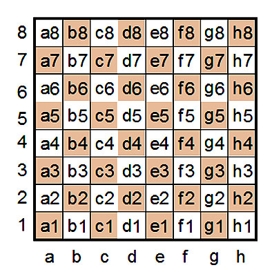 Поля шахматной доски обозначаются по горизонтали буквами латинского алфавита – a, b, c, d, e, f, g, h (горизонтальная ось координат), а по вертикали арабскими цифрами – 1, 2, 3, 4, 5, 6, 7, 8 (вертикальная ось координат). Тем самым вводится двумерная или плоская система координат, в которой каждая клетка доски обозначается двумя знаками: латинской буквой, соответствующей вертикальному столбцу и цифрой – соответствующей горизонтальному ряду, на пересечении которых находится данная клетка доски.