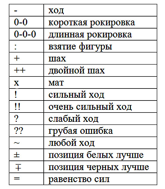 При записи шахматной партии вначале указывается порядковый номер хода, который отделяется от записи самого хода точкой. После порядкового номера хода и точки указывается обозначение фигуры, делающей ход (кроме пешек), поле, с которого она пошла, и после тире или знака взятия – поле, на которое она пошла. При ходе белых и ответе черных номер хода указывается только для белых, а ход черных записывается в этой же строчке через пробел после хода белых.