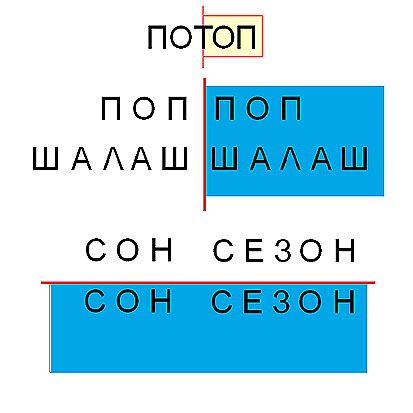 Переходя от букв к словам мы можем отыскать в них те же виды симметрии. Есть слова, у которых ось симметрии проходит, деля слово пополам. Далее, если к написанному слову приставить справа вертикальное зеркало, то отражение симметричного слова будет полностью совпадать с оригиналом. Аналогично есть слова, которые не изменяются при отражении в горизонтальном зеркале.