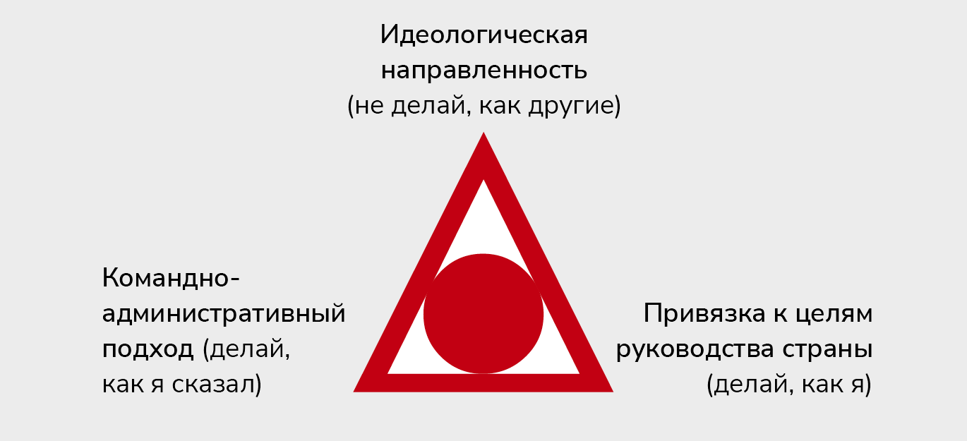 Так идеологическая направленность страны мешала развитию рыночных отношений. Мало того, что управление было по команде, так ещё и действовал принцип «не быть таким, как другие»! Зачем перенимать положительный опыт других стран, когда мы можем изобрести нечто новое, своё? (Даже если это изобретение никому не нужно или им неудобно пользоваться.)
