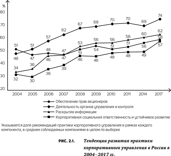 Общая картина внедрения рекомендаций CGBP в практику российских компаний в разрезе компонентов за период 2004–2017 гг. приведена на рис. 2.1.