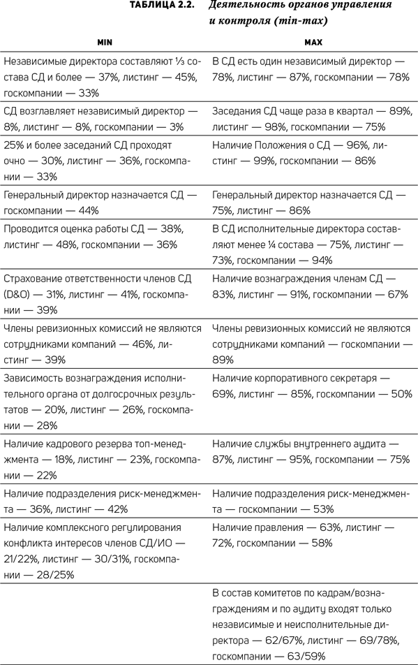 Данный компонент практики корпоративного управления в исследовании охватывает самое большое число, целых 44 рекомендации CGBP. В табл. 2.2 представлены результаты анализа в формате min-max.