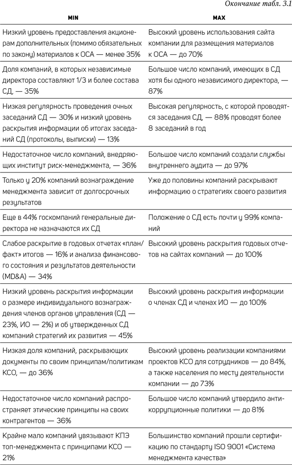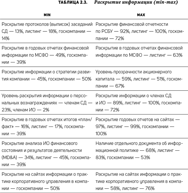 Данный компонент практики корпоративного управления в исследовании охватывает 20 рекомендаций CGBP. В табл. 2.3 представлены результаты анализа в формате min-max.