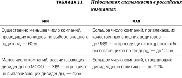 И что же мы видим? Компании, соблюдая на высоком уровне одни рекомендации (колонка max), крайне плохо соблюдают другие взаимозависимые/связанные рекомендации (колонка min). Получается, если образно представить эти две колонки в виде двух полушарий мозга, то одна половина не ведает, что творит вторая, – почти точное описание шизофрении; а если применить образ человека целиком, то получается, что у него одна рука существенно длиннее другой. Как вам такой homo sapiens? А если серьезно, то это явный признак отсутствия у компаний системного подхода к построению своих систем корпоративного управления – ведь нельзя, чтобы значения показателей в одной строке и в разных колонках настолько (!) отличались. Это приводит к уменьшению синергетического эффекта от двух (или более) связанных рекомендаций, а то и к уменьшению эффекта от выполнения на высоком уровне одной из них. Я уже цитировал и буду еще не раз апеллировать к мыслям о системности как базовом принципе построения и организации работы управленческих систем, изложенном в книге одного из гуру системного анализа Д. Гараедаги «Системное мышление» (20). Для систем корпоративного управления как систем самого верхнего стратегического уровня управления компаний его мысли имеют, пожалуй, главенствующее значение. Но в своей практике, как в консалтинговой и исследовательской, так и в качестве независимого директора в советах директоров российских компаний, я встречаю, пожалуй, больше несистемности, чем системности, – катастрофически больше. Не хватает российским компаниям именно системного мышления, очень не хватает!
