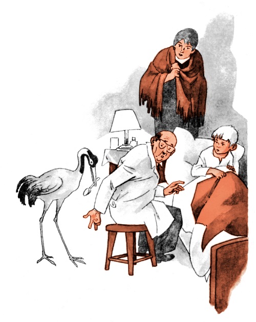 Ночью мальчик метался в жару. Когда в доме погасили свет, Журавлик подошёл к кровати больного и положил свой большой прохладный нос на горячую голову мальчика.