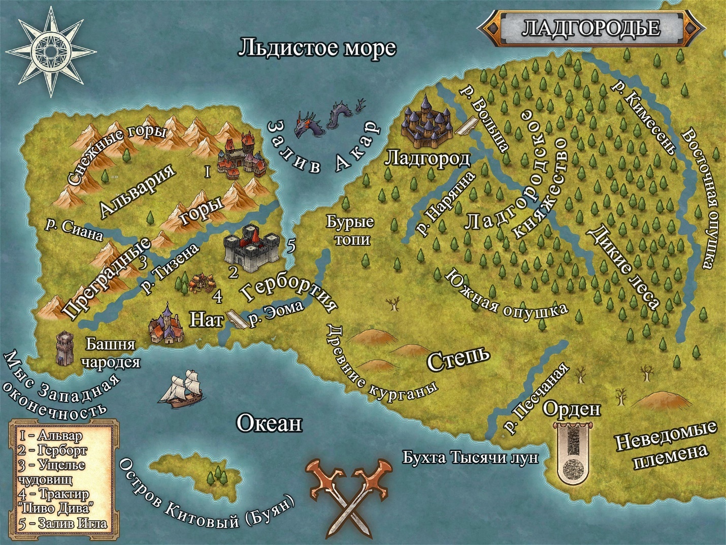 В стародавние времена на зелёных долах, средь крутых холмов и могучих рек, стоял славный город Ладгород, и по названию его все окрестности звались Ладгородским княжеством или попросту – Ладгородьем. К западу от него, за дикими лесами и холодным заливом Акар, располагались страны Альвария и Гербортия, находящиеся в бесконечной череде войн и мира между собой. На юге вновь был дремучий лес, а потом начинались бескрайние степи, где обитали неведомые племена. За их пастбищами располагались владения загадочного Ордена, о котором почти никто ничего не знал, за исключением того, что послушники его носили серебряные капюшоны. К юго-западу раскинулся океан со стоящим на побережье вольным городом Натом, а ещё дальше, в бескрайнем царстве солёной воды, был, говорят, будто бы какой-то остров. Кто-то называл его Китовым, а иные – Буяном. Что находилось на востоке, в Ладгородье не знали. На севере простиралось море, летом синее, а зимами укрытое льдом и от того называемое Льдистым. Дальше не было ничего, лишь стылый ветер, за пределы которого никто не был в силах проникнуть…