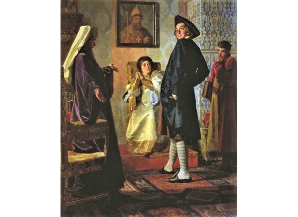 Пётр I в иноземном наряде перед матерью своей царицей Натальей, патриархом Андрианом и учителем Зотовым. Худ. Н. Неврев
