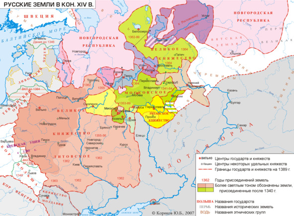 Эпоха Дмитрия Донского, открывающаяся со второй половины четырнадцатого века, противоречива. Победа над войсками Мамая, тестя правителя Орды, Бердибека, в 1380 году, ничего особенно не меняет. Остатки войск Мамая, набирающие силы в Крыму добивает наследник Чингисхана, хан Тохтамыш. Мамай живет недалеко от Кафы, ввязывается в борьбу с приютившими его генуэзцами, и в результате лишается головы. Ягайло (Яков), союзник Мамая, он же Владислав Второй Ягелло, князь витебский, великий князь литовский, позже – король Польский, участия в битве не принимает. В 1384 г. на одной из граней Истории решается важный вопрос. Уния с Польшей, или союз с Россией? Выпадает первый вариант. Спустя два года Литовское княжество переходит в католическую веру. Великий князь женится на 13-летней польской принцессе Ядвиге. Его потомки (от второй и четвертой жены) образуют династию Ягеллонов, правящей Речью Посполитой до 1572 г.