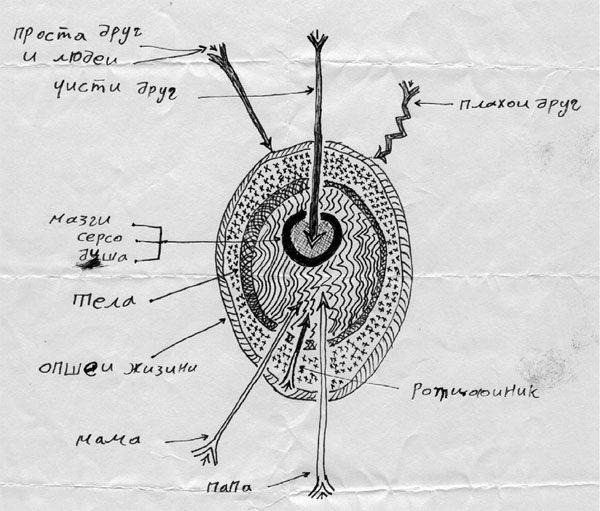 Хасан, 30 лет, беженец из восточной страны, с юного возраста участвовал в военных действиях, неоднократно заключался в тюрьму, где подвергался пыткам. Оказался в России один, лишенный контактов и каких-либо сведений о семье. Вырос в благополучной семье: «В детстве я не знал огорчений, все красивыми словами разговаривали». Обратился к психологу с жалобами на нарушение сна и неконтролируемые аффективные вспышки, в ходе которых появлялось непреодолимое желание себя поранить. Увидев свою кровь, начинал плакать. Развитие приступа мог приостанавить человек, которому Хасан доверял: если он крепко его держал, то двигательное возбуждение сменялось разрядкой и плачем. На пятый сеанс Хасан принес и отдал психологу свой рисунок (рисунок 1), сопроводив его такими словами: «В метро есть карты метро, а это карта души». Хасан сказал также, что сразу понимает по глазам намерения человека. Терапия этого клиента не была длительной, поскольку вскоре он покинул Россию.