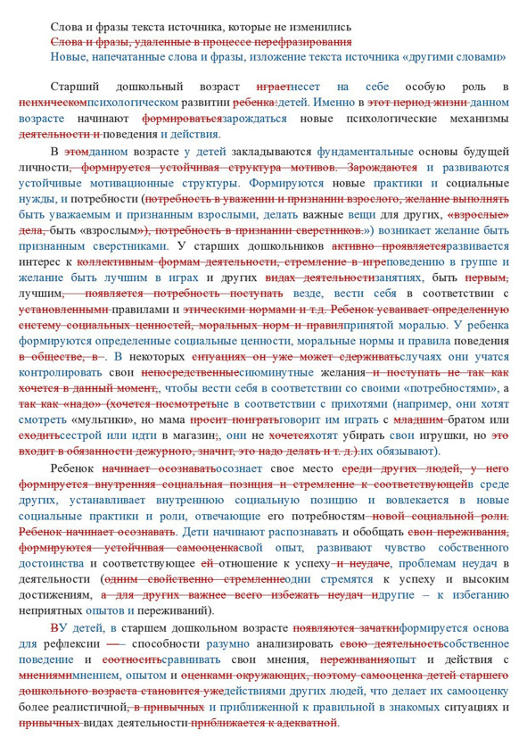 На рис. 3 видно, как основательно переработан текст, в результате глубокого перефразирования КонтрПлагиат, то, что напечатано обычным черным цветом, это текст, который не изменился, синим цветом выделены слова и фразы, придуманные заново, а красным отмечен удаленный текст. Человек потратит на глубокий рерайт такого текста больше времени, чем КонтрПлагиат, перефразирующий текст такого объема за 15 сек.