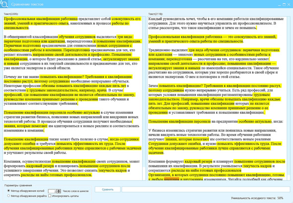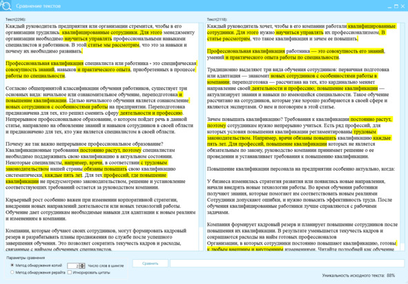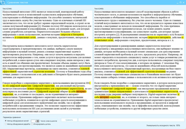 Рисунок 6 – Сверка текста источника (правое окно) с перефразированным текстом (левое окно) по методу шинглов, состоящим их 3 слов, желтым выделены шинглы, которые не изменились, отличие текстов 95%