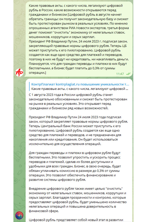 С весны 2023 года Антиплагиат научился находить тексты, написанные с помощью искусственного интеллекта, щедро раздавая статусы: «Внимание, документ подозрительный: в документе присутствует сгенерированный текст», На следующий день КонтрПлагиат предложил услугу очеловечивания текстов, созданных с помощью любого искусственного интеллекта, рис. 2.