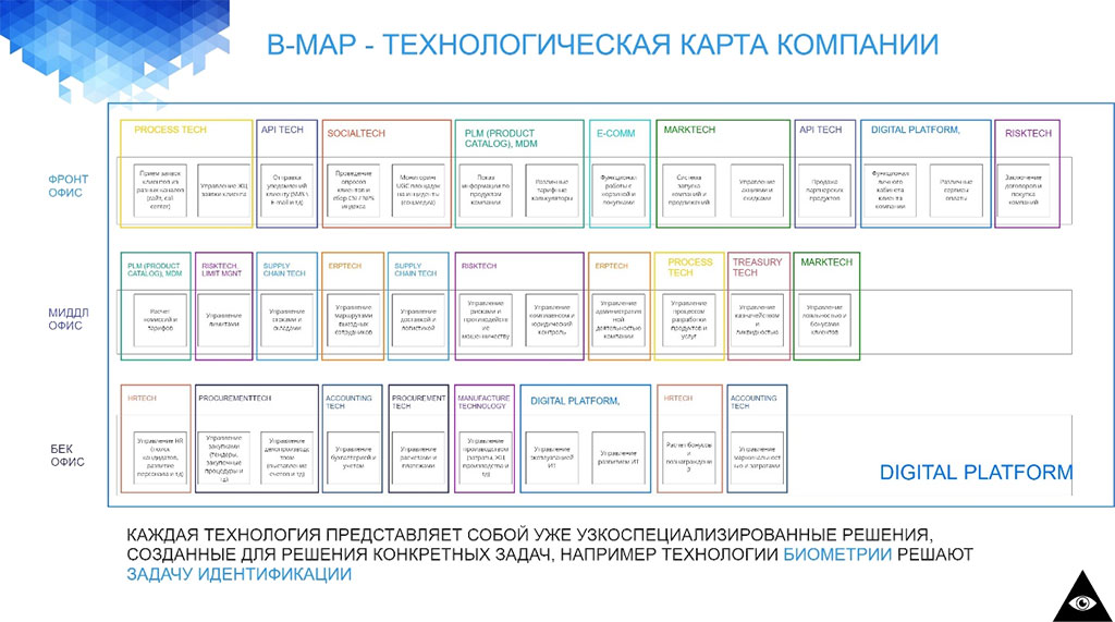 В проектировании, эти кубики называются Use Case (или сценарии использования технологии), в Agile, они носят название User Story (пользовательские истории) и т.д. Сам термин Use Case возник в языке UML (Unified Modeling Language – унифицированный язык проектирования). Этот открытый язык появился в период с 1984 по 1995 год, и стал активно использоваться в качестве, лучших практик моделирования и создания технологии. Любая технология решает определенные Use Case. Не больше, ни меньше. Я буду часто к этой аксиоме возвращаться, чтобы вы это запомнили. Нет универсальной технологии, каждая решает конкретные задачи. Если в вашей компании, технология не работает, а в другой компании работает, а это точно так, иначе бы технология не существовала, то видимо вы ее неправильно используете. В части кейсов, в мире появилось большое количество функциональных систем, которые заточены делать конкретную функцию, например управлять процессами (системы типа BPM) или управлять рисками внутри организации, например кредитными или операционными (такое семейство технологии можно назвать Risktech). Как вы заметили, название того или иного семейства технологий складывается из 2х слов, это “названия предметной области” + “tech”, краткого от англ. technology (технология). Часть таких акронимов вы, наверное, не слышали, например API Tech (технологии для управления интеграцией), а другие возможно слышали HR Tech (технологии в управлении персоналом – HR). Я специально все типы технологий привожу к единому знаменателю, чтобы вам было проще ориентироваться в них. Задача этой книги, не помочь вам выучить, все эти технологии, а помочь вам ориентироваться во всем этом множестве. Все эти названия, они не конечные, их можно дробить на подклассы, придумывать новые названия. Но в целом, это некий такой нулевой уровень, на мой взгляд с которого все начинается, и который является общим для 99 % компаний. Если не верите, можете взять свою компанию и попробовать составить для нее b-map.
