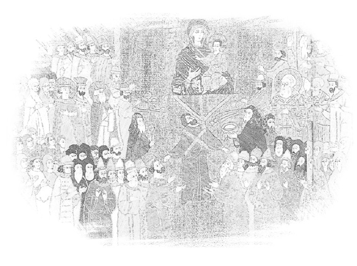 Очевидно в нижнем ряду, четвёртой слева в богатом, с золотыми застёжками, платье, в высокой меховой шапке изображена сама Елена Волошанка.