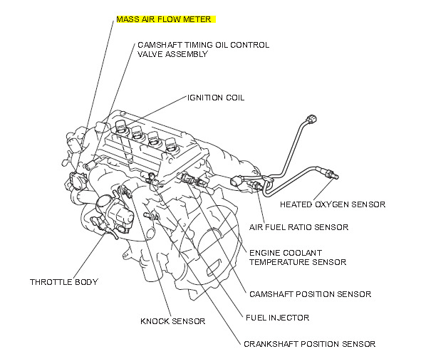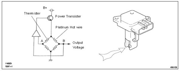 Датчик массового расхода воздуха (MAF) помещается в поток всасываемого воздуха. Он измеряет расход всасывания, измеряя часть всего потока впуска. Он состоит из горячей платиновой проволоки, на которую подается электрический ток от модуля управления двигателем (ECM). Температура горячей проволоки контролируется ECM. Тепло, генерируемое горячей проволокой, уменьшается по мере того, как всасывающий воздух течет сквозь него. Чем больше воздуха, тем больше потери тепла. Поэтому ECM должен подавать больше электрического тока для поддержания температуры горячей проволоки при увеличении воздушного потока. ECM обнаруживает поток воздуха с помощью этого изменения тока.