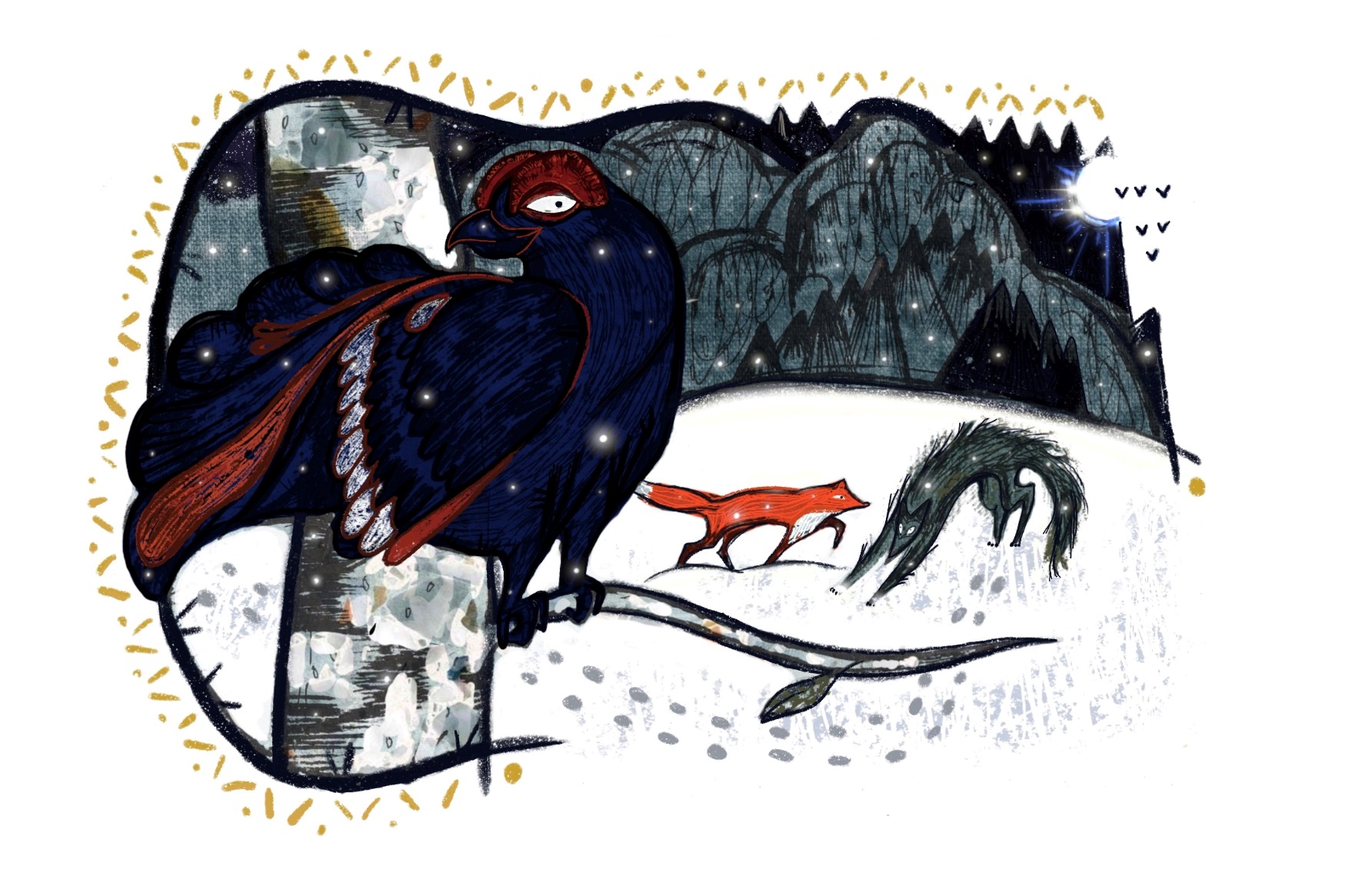 Старый тетерев, нахохлившись, поёживался от мороза на макушке высокой сосны. Вздремнуть бы. Да только как тут уснёшь! Галдёж, вопли, суета. Тетерев вытянул шею, чтобы разглядеть меж отяжелевших от снега сосновых лап, что за кавардак внизу творится.