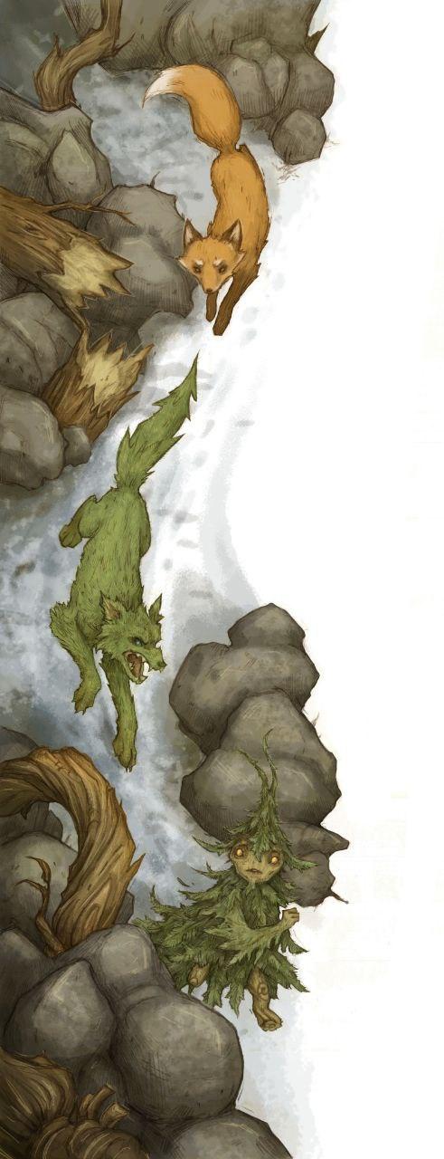 Тут Рычун почуял, что рядом ещё кто-то есть. К знакомым лисьим и человеческим запахам примешался землисто-грибной, прелый с нотками пожухлых листьев. Волк, конечно же, узнал его.