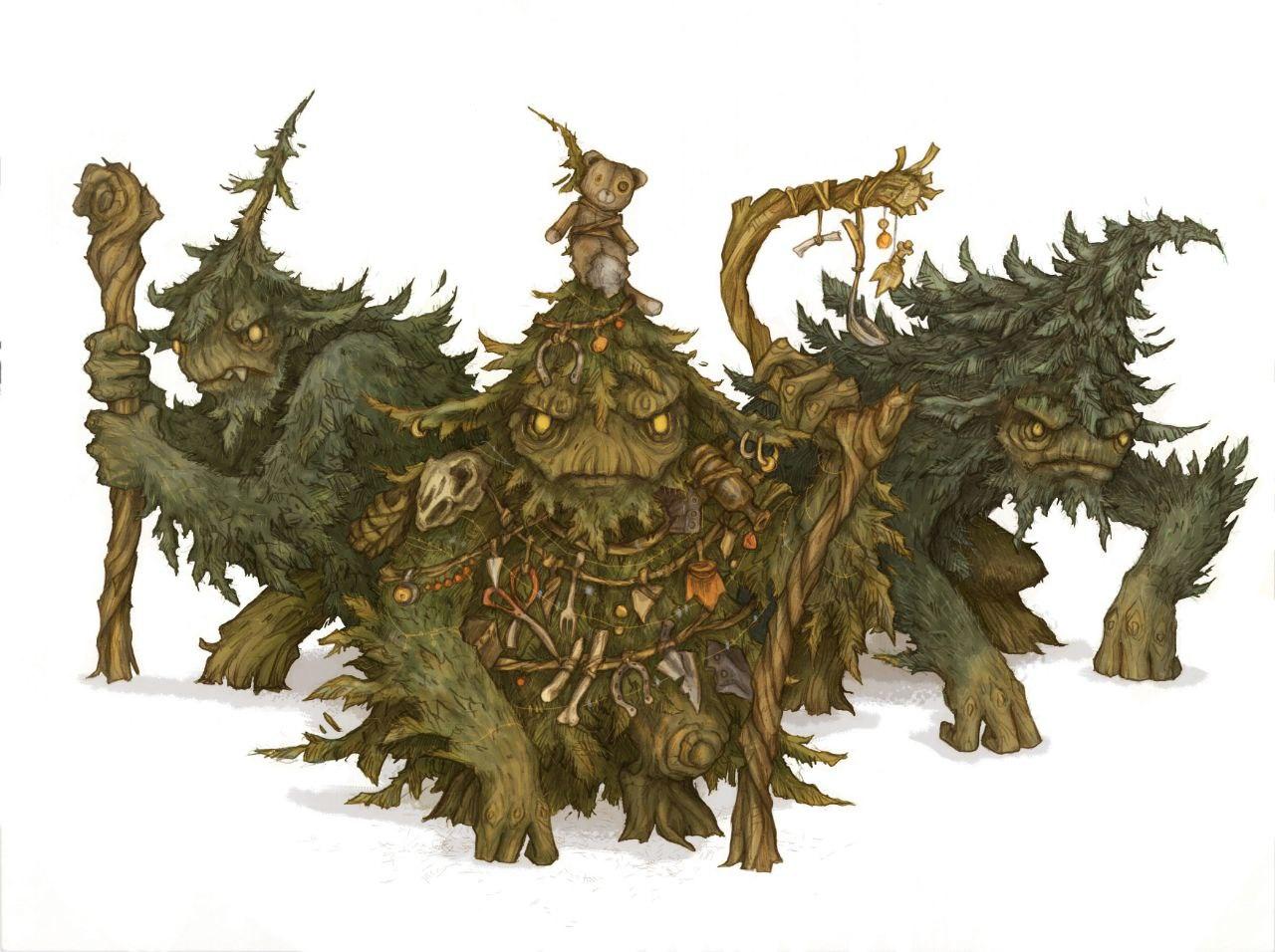 Вдруг страшилища как по команде затопали и гулко захлопали в тяжёлые ладоши, загалдели, и в пещеру пролез дряхлый пихтовик. Он шёл вперевалку, хромая и скособочившись. Его облезлые спутанные ветви торчали в беспорядке. С макушки до пяток пихтовик был увешан рухлядью, которая постукивала, дребезжала и лязгала при каждом его шаге. Осколки глиняных горшков бились о ржавые подковы, рваный лапоть шоркал об обломок лопатки, грязные носки болтались рядом с заячьим черепом, звенели сосульки, а на самой макушке болтался рваный плюшевый мишка. Интересно, как часто пихтовики наведывались в деревню, чтобы собрать этот хлам?