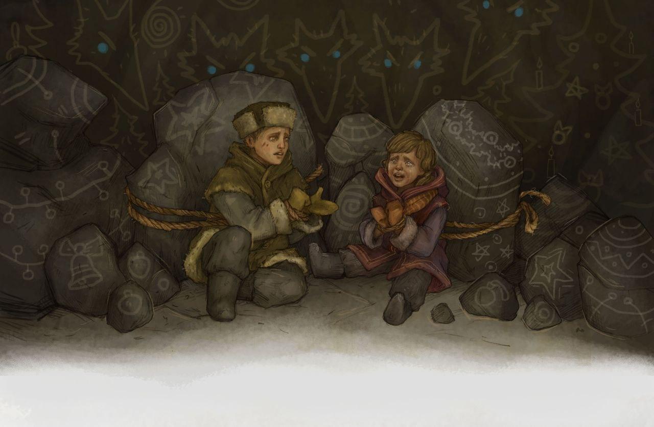 Когда малыши разбрелись, пихтовики бросили оставшиеся подарки к ногам пленников. Рыжей Цунами достался перетянутый обрывком грязной верёвки обломок толстого корня, Рычуну – чёрный блестящий камень. Перед Машей с Вовой валялись две мёртвые вороны. Дети заголосили с удвоенной силой.