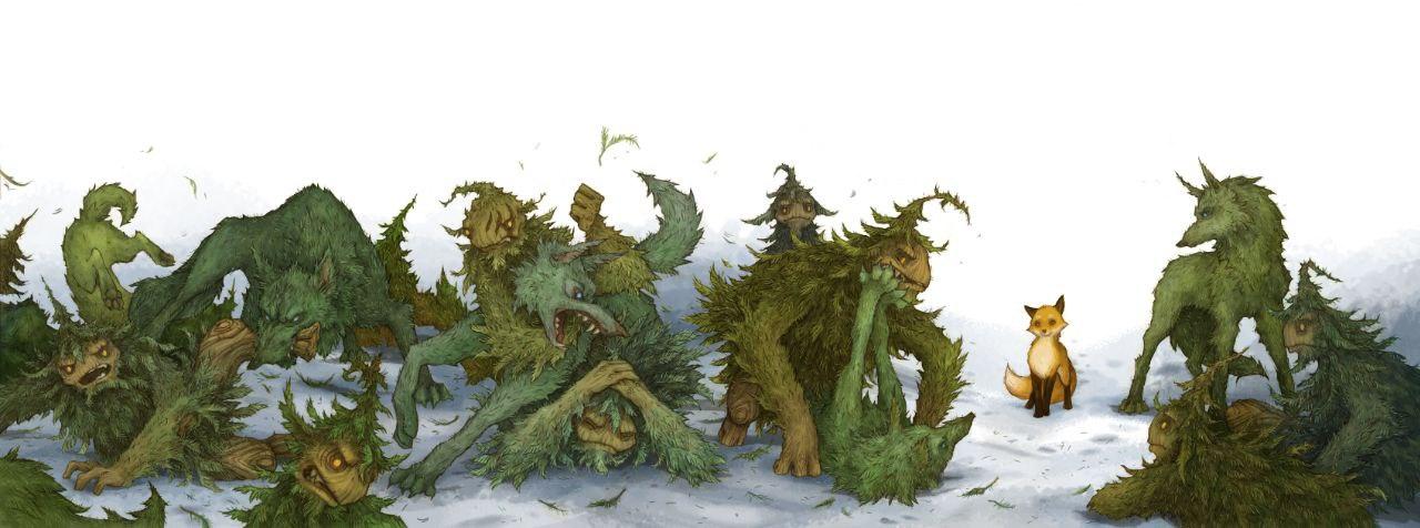 Она обернулась и выразительно посмотрела на Чернолапа, всё ещё сжимающего мощными клыкастыми челюстями толстую ветку пихтовика. Пелена ярости сползла с его глаз. Чернолап разжал зубы. Гигант-пихтовик, выдохнув, опустил дубину. К сожалению, та упала прямо на хвост вожака еловых волков. Тот взревел, стая поддержала его и ринулась на врага. Пихтовики загудели и вприпрыжку бросились навстречу. Все быстро забыли про храбрую лисичку. В воздухе замелькали дубинки, лапы, хвосты, ветки.